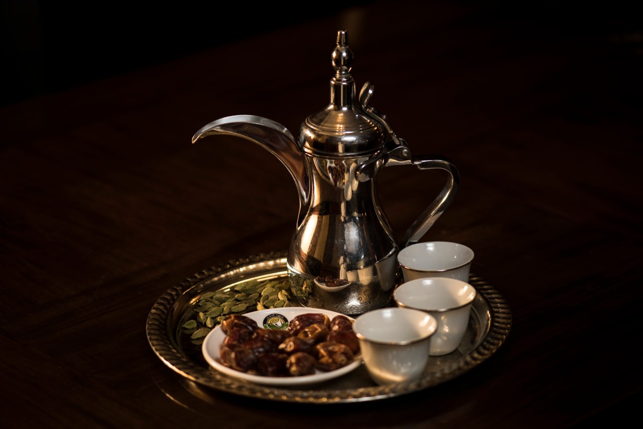 Omani coffee is almost green, lightly roasted, and ground with cardamom. After the delicate elixir has been brewed, a teaspoon or two of rose water is added to the insulated serving pot. The kahwa is served in small, handless glasses called fenjans. The accompanying dates act as natural sweeteners. A guest’s fenjan will be refilled continuously until he or she shakes it, signalling that they have had enough. Small portions ensure that the coffee stays hot and that the host has ample opportunity to honor his guest and his home through his act of hospitality.